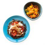 Mezcla en un bol el resto de frutas y verduras (excepto el tomate) + las especias + la miel + el vinagre + 2 Tbsp aceite de oliva.