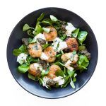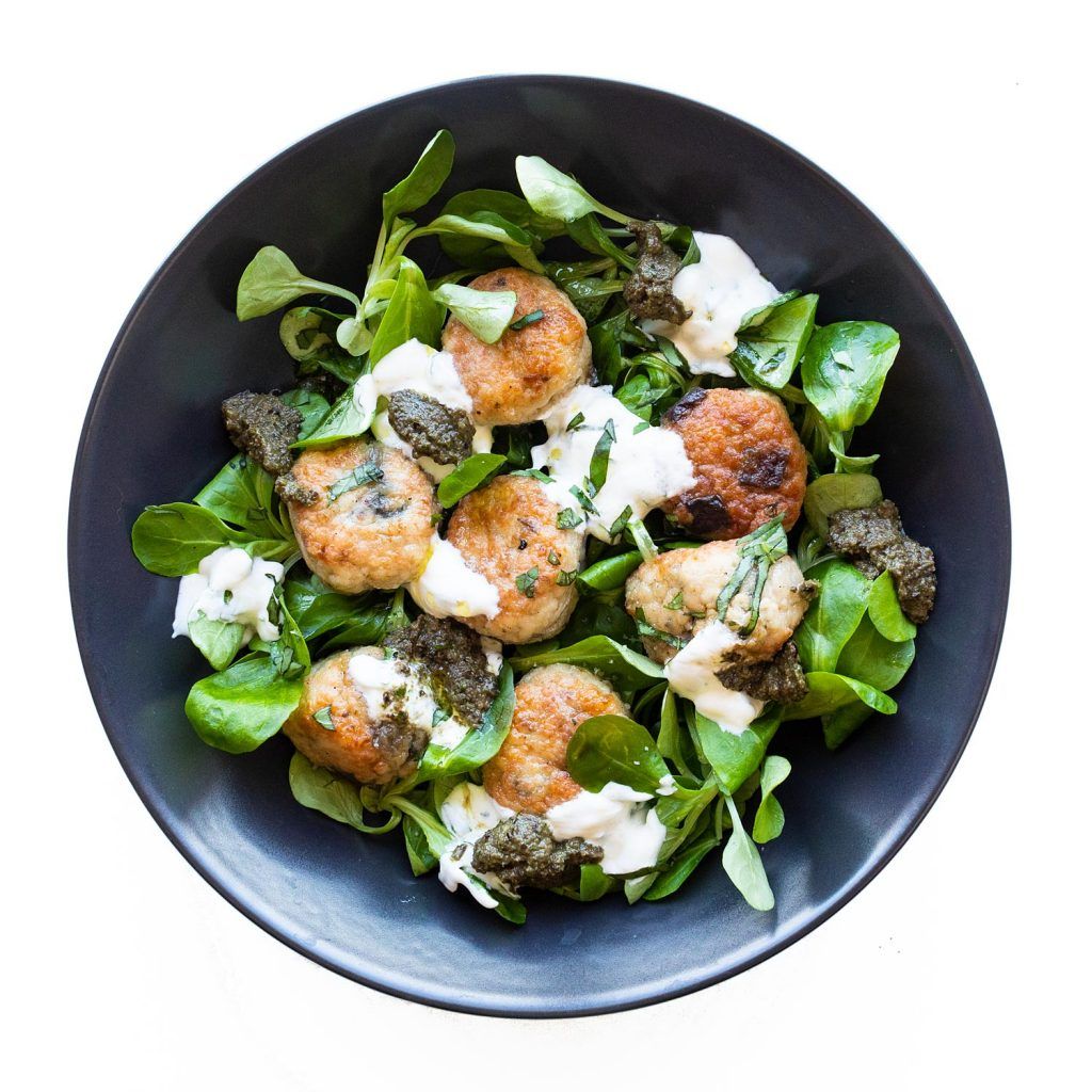 Coloca los canónigos en la base del plato y añade las albóndigas + el tapenade.
