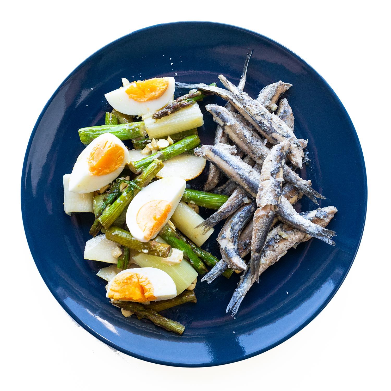 En la misma sartén con 1 Tbsp aceite de oliva, saltea los espárragos + ¼ tsp sal durante 4-5 minutos.
