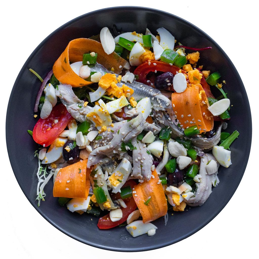 Mezcla en un bol todos los ingredientes y aliña (recomendable vinagre de Jerez o balsámico). Recuerda utilizar el propio aceite del recipiente de boquerones para aliñar tus ensaladas, ¡verás qué toque tan rico les aporta! Y si tienes a mano, unos dados de queso curado le irán fenomenal a este plato.
