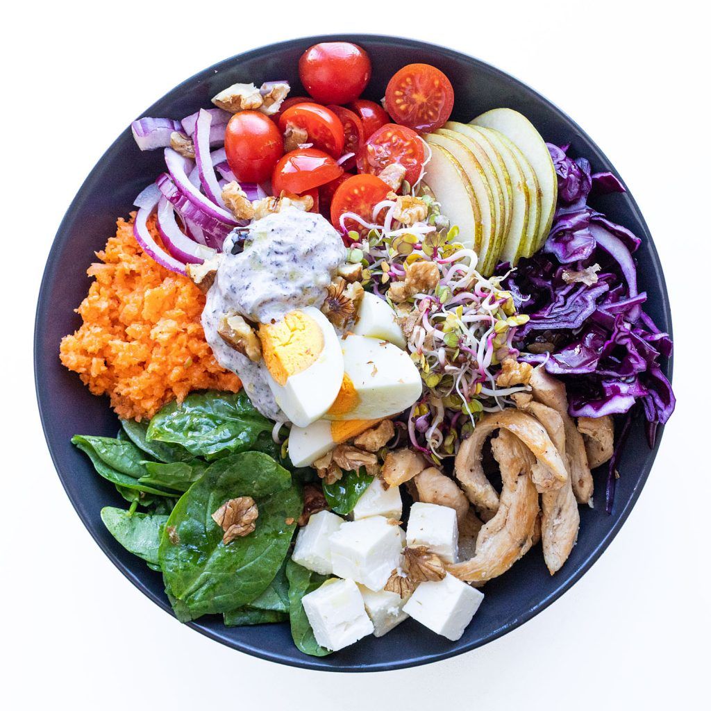 Bowl Griego de Pollo con Feta, Espinacas, Pera y Nueces