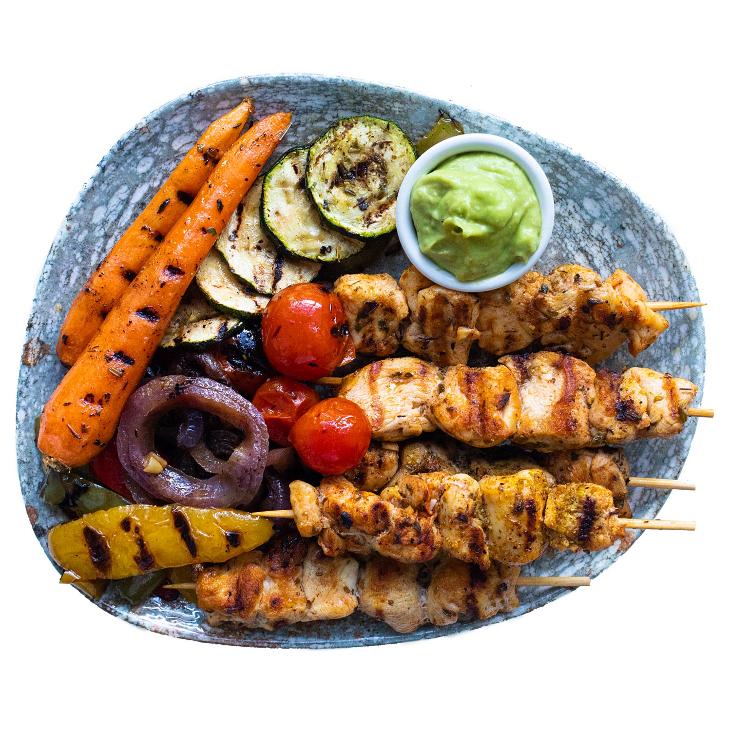 Salsea las brochetas con el alioli y acompaña con la parrillada. Sirve.
