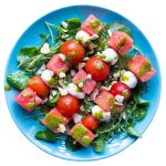 Pincha los dados de sandía + los tomates + el queso en los palos de brocheta.