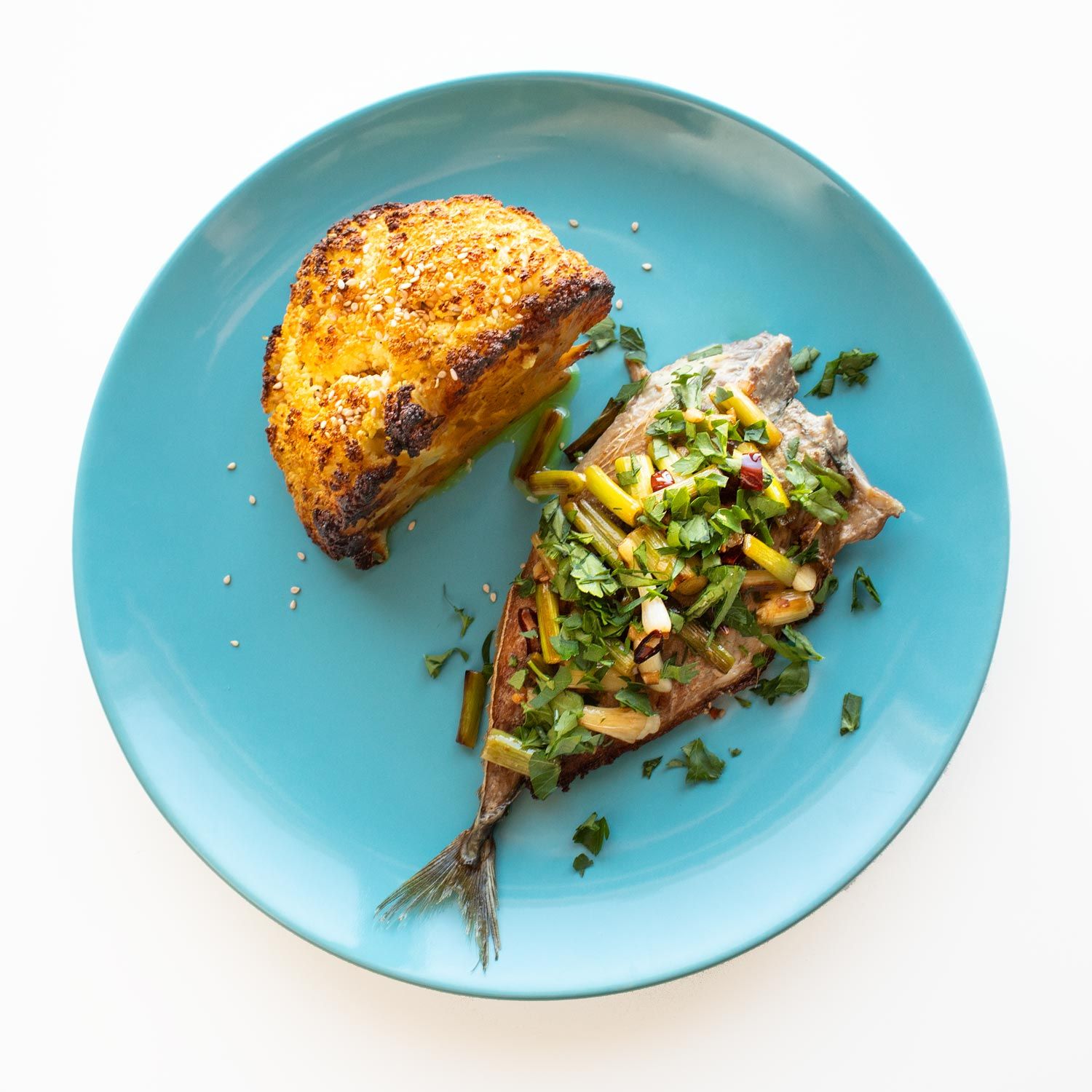 Corta la coliflor en 4 partes, sirve junto al pescado y disfruta.