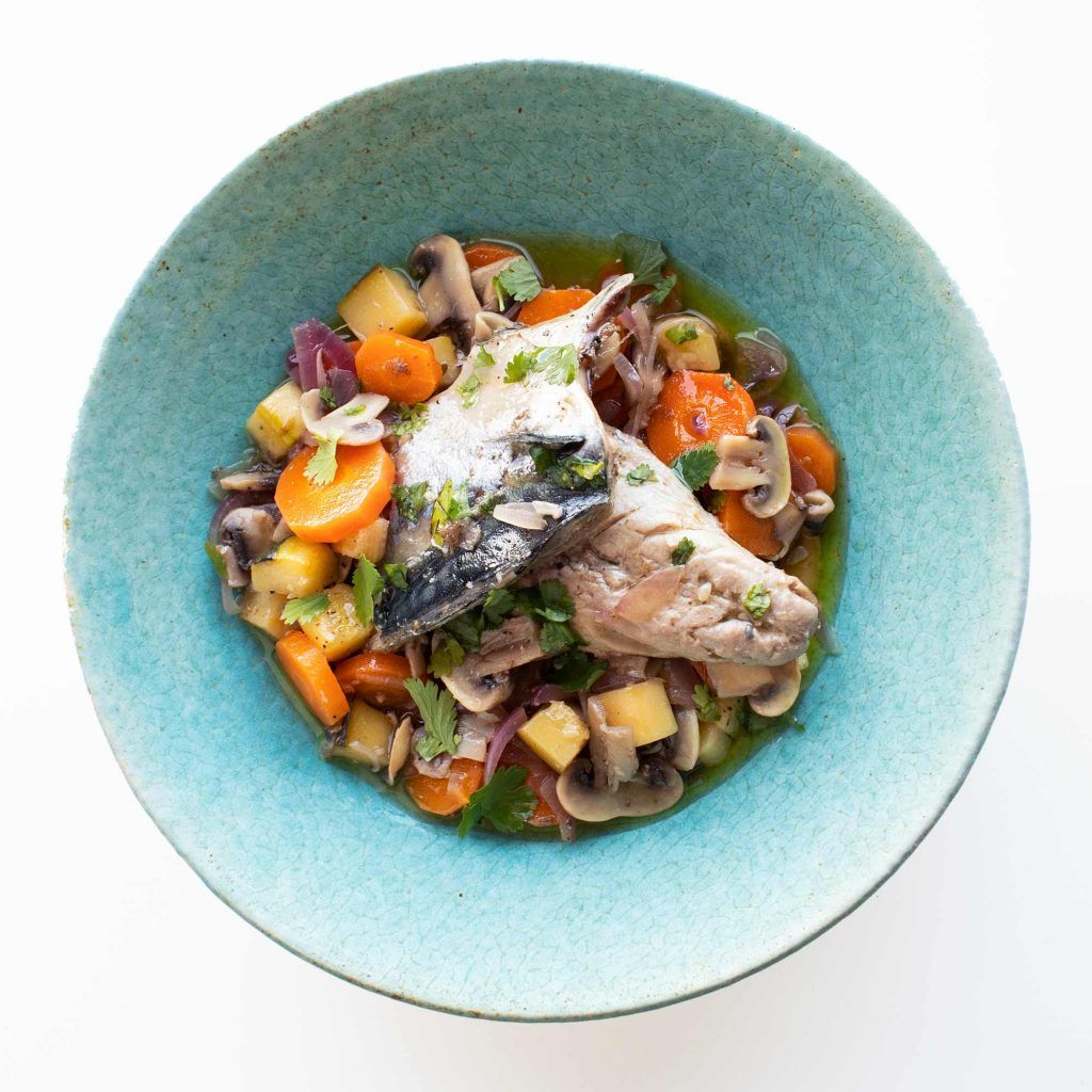 Añade el vino y evapora el alcohol 3 minutos. Añade el vinagre + el agua + ½ cup aceite de oliva, mezcla hasta integrar y añade la caballa. Cuando rompa a hervir, baja a fuego bajo y cuece 5 minutos. Retira del fuego y deja templar. Guarda en la nevera 12 horas como mínimo.
