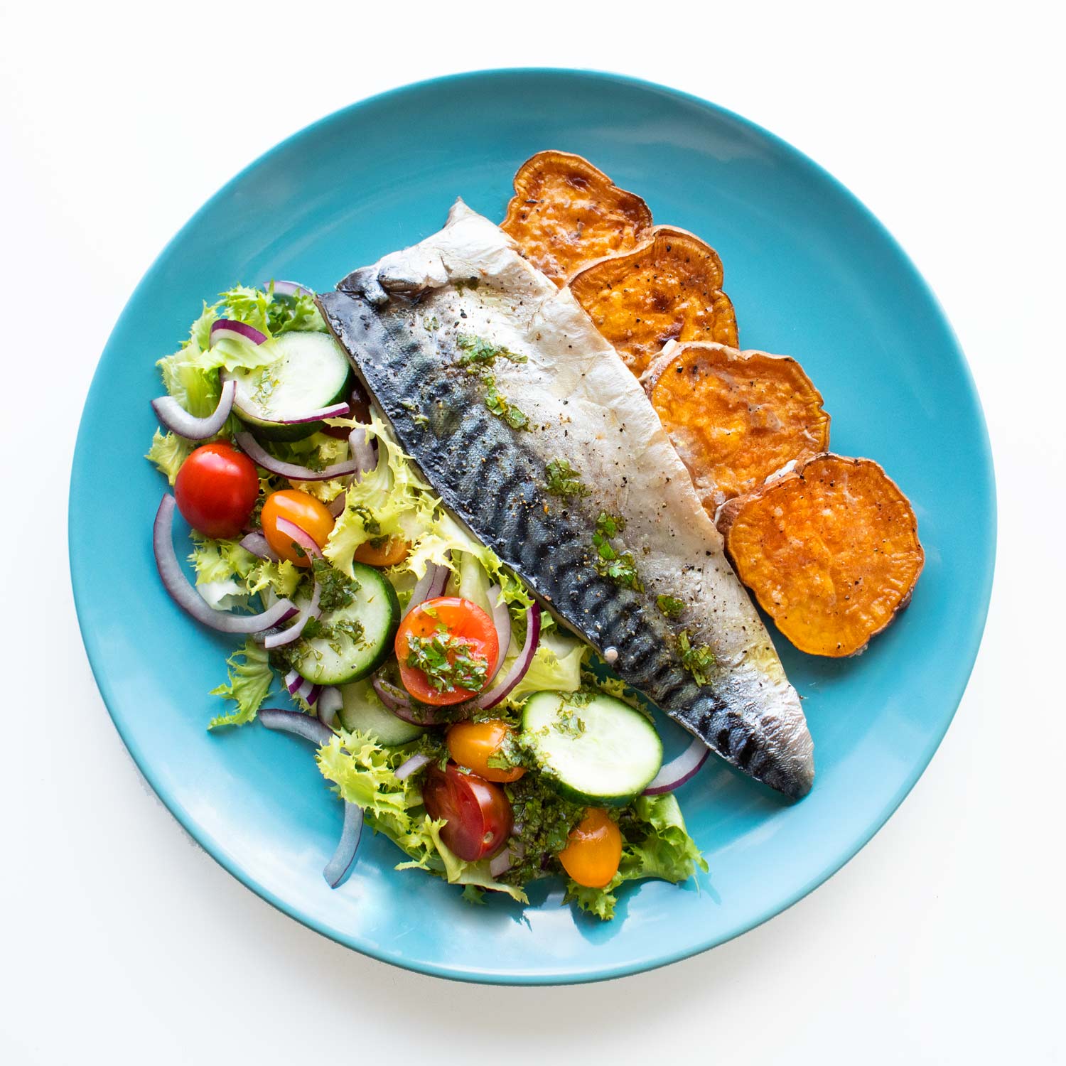 Pasado este tiempo, saca la bandeja del horno y coloca la caballa sobre el boniato. Sazona con ¼ tsp sal.