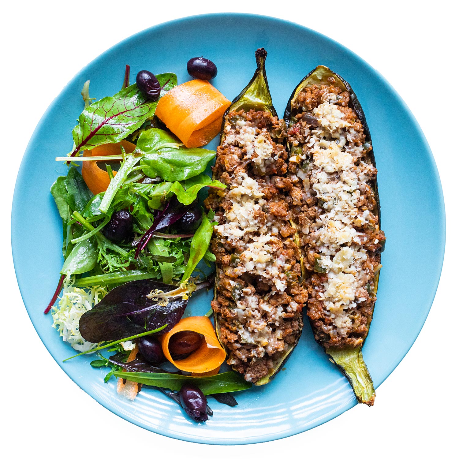 Rellena los calabacines asados con la mezcla y cubre con el queso (si haces AIP, espolvorea la levadura cuando los saques del horno).