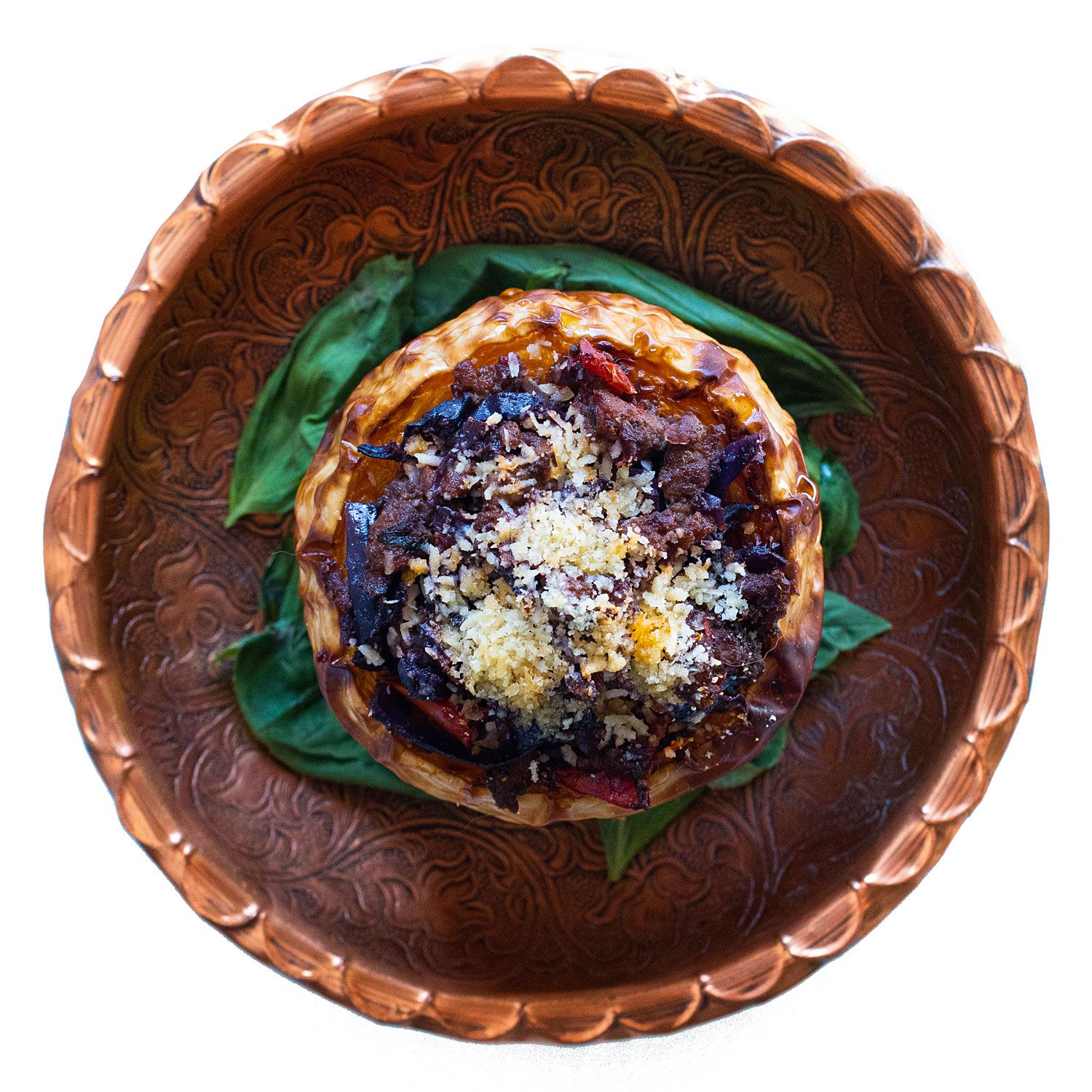 Rellena los cuencos de calabaza con el chili y espolvorea el parmesano (si haces AIP, añade la levadura cuando los saques del horno).
