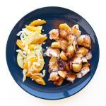 Coloca el pulpo en rodajas sobre las patatas y aliña con el pimentón + 3 Tbsp aceite de oliva + ¼ tsp sal.