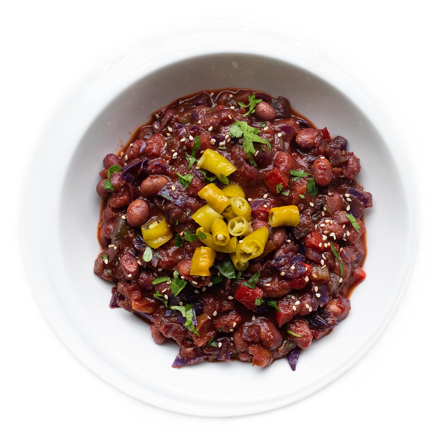Sirve los encurtidos sobre el chili y decora con el cilantro.