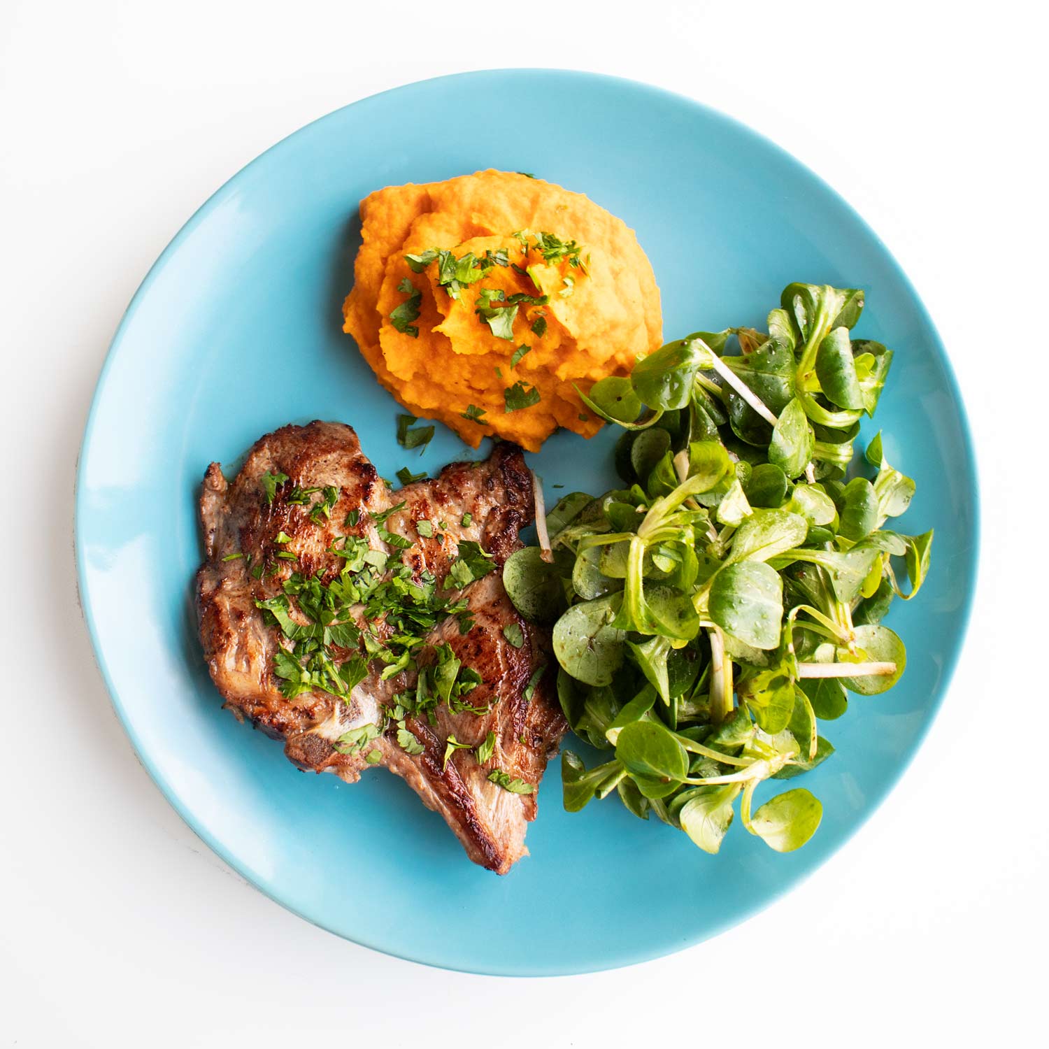 Pon una sartén a fuego medio-alto. Añade 2 Tbsp aceite de oliva y fríe las chuletas durante 3 minutos por cada lado. Decora con el perejil.
