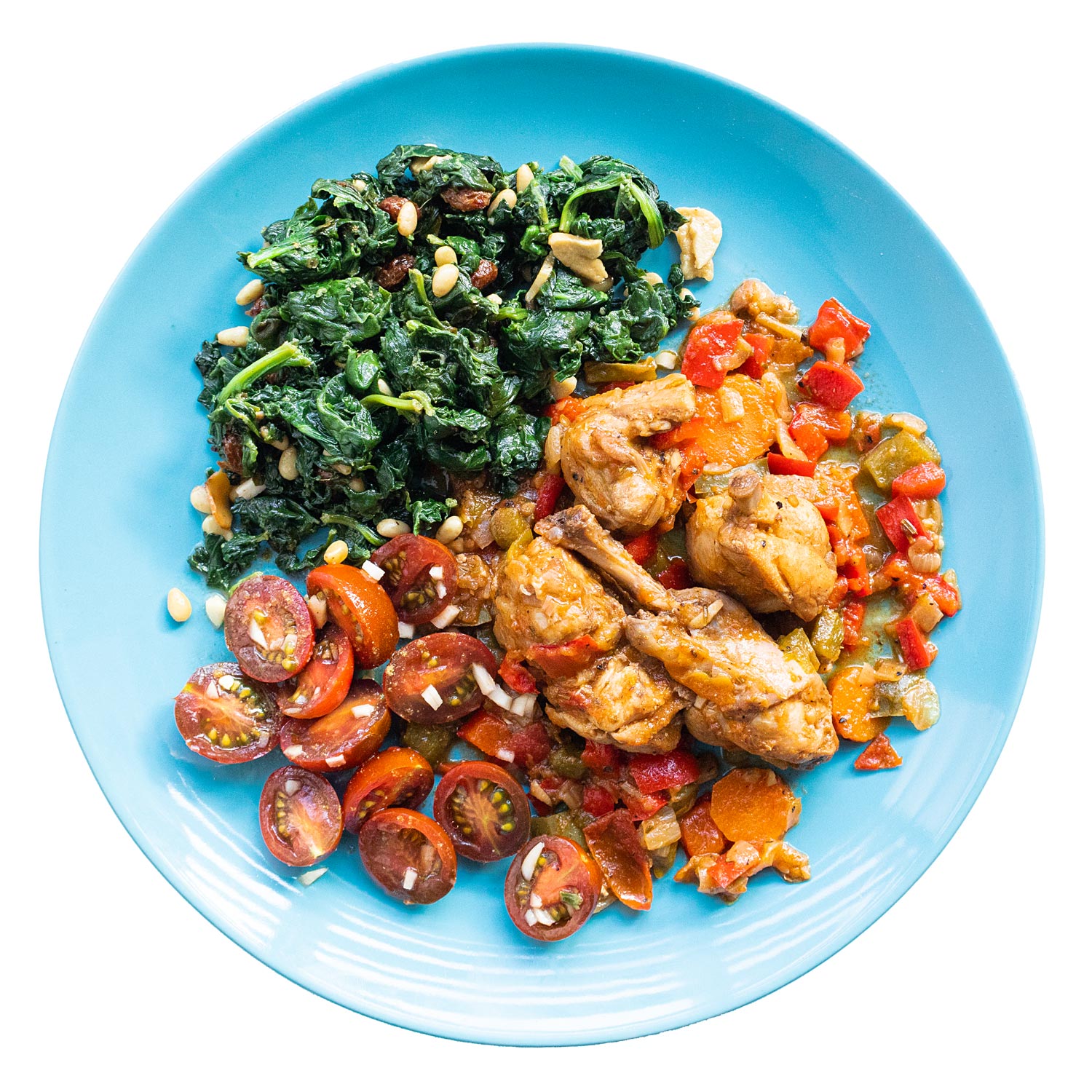 Sirve el conejo con las espinacas y acompaña con el tomate.