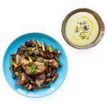 A mitad de cocción añade las setas y ajetes + el resto del vino blanco y da la vuelta al conejo.
