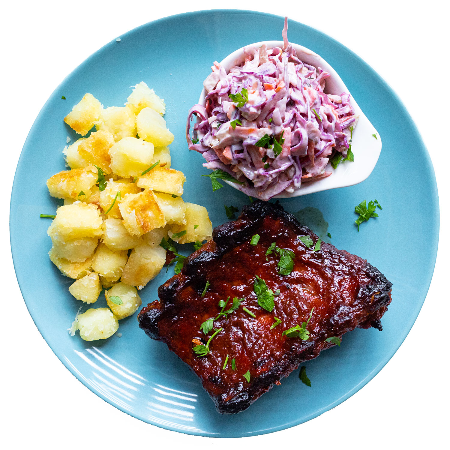 Sirve las costillas y acompaña con el coleslaw. Decora con el perejil. Este plato ya está completo con la costilla y el coleslaw, pero si quieres preparar un festín especial, puedes añadir un poco de la yuca cocida o patata para acompañar.
