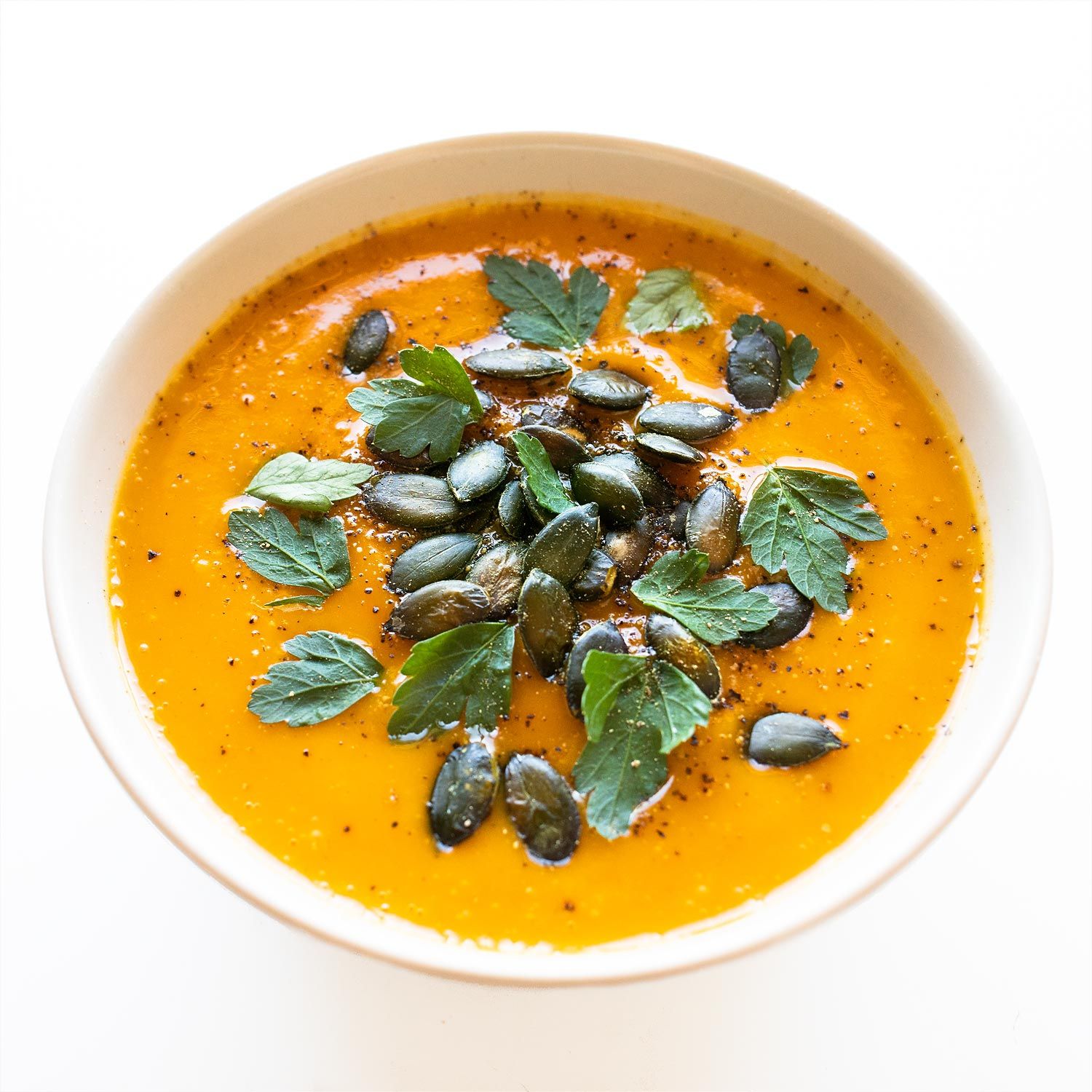 Cuando la calabaza esté cocinada, sácala del horno y espera unos 15 minutos hasta que la puedas manipular. Con una cuchara grande, retira la carne de la calabaza de la piel y añádela a la cazuela junto con el caldo.