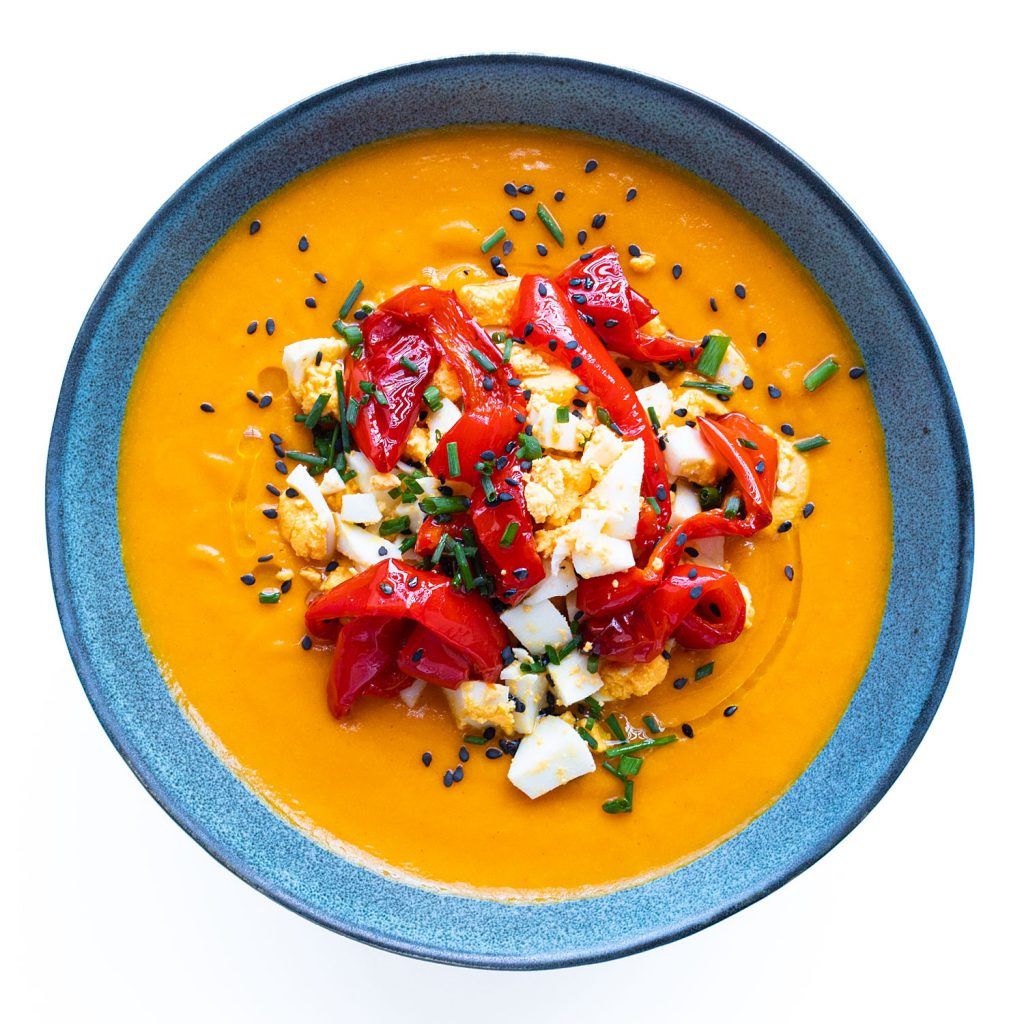Sirve el puré en boles y coloca encima el huevo + los pimientos. Decora con las semillas + el cebollino y sirve.