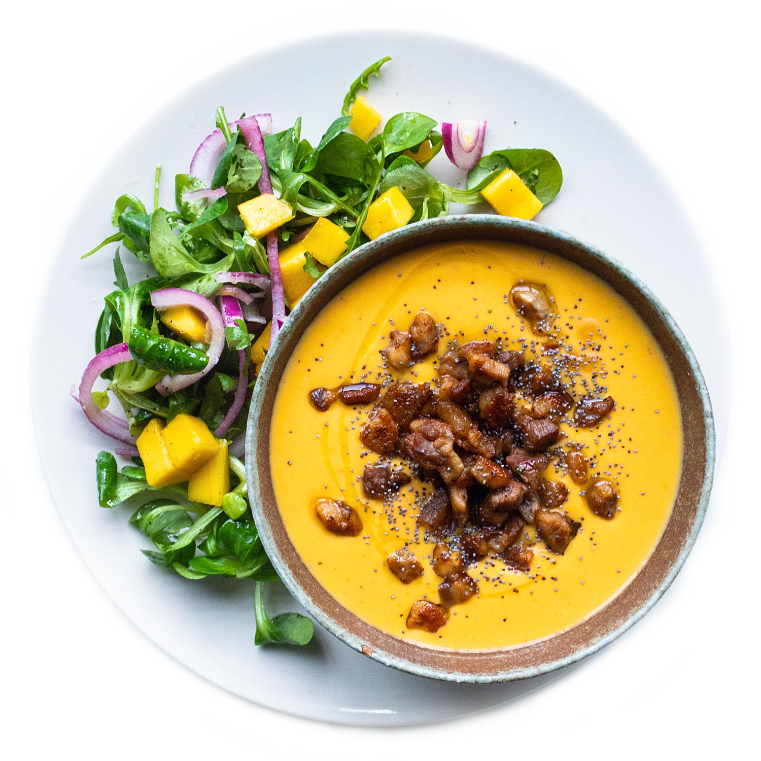 Sirve la panceta sobre la crema y decora con las semillas. Acompaña con la ensalada.