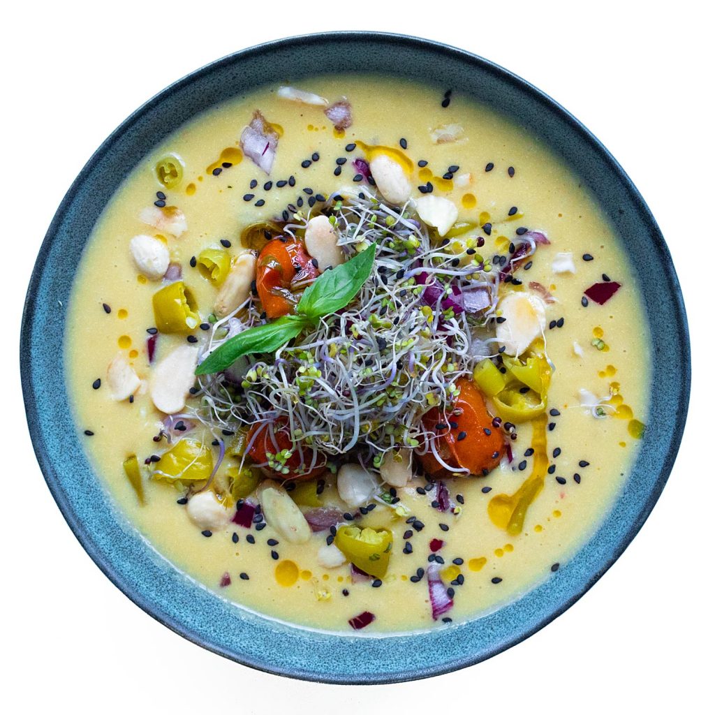 Sirve la crema en boles y coloca encima el resto de ingredientes. Decora con las semillas + la albahaca.