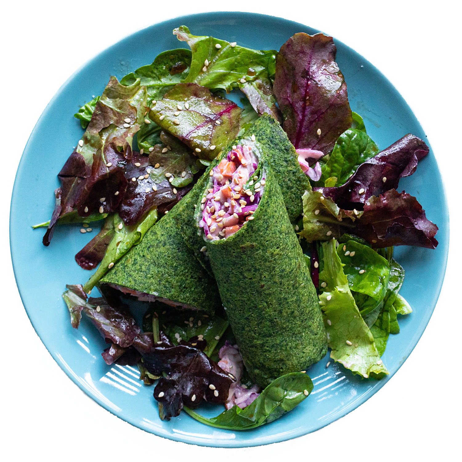 Extiende los crepes sobre la encimera y rellena con el coleslaw. Corta en dos mitades