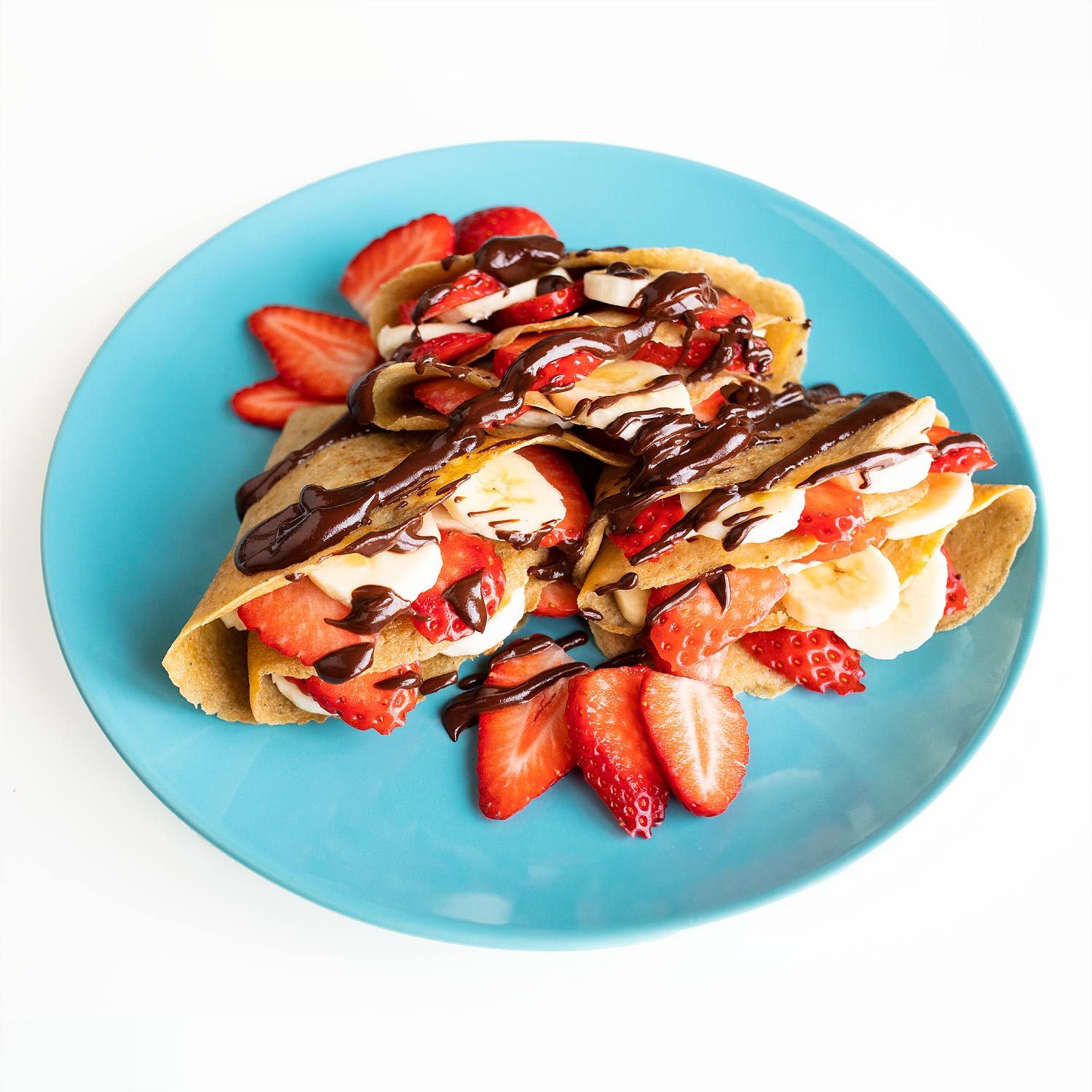 Sirve las crepes rellenas de fruta de temporada, enrolla o dóblalas y echa la salsa por encima.