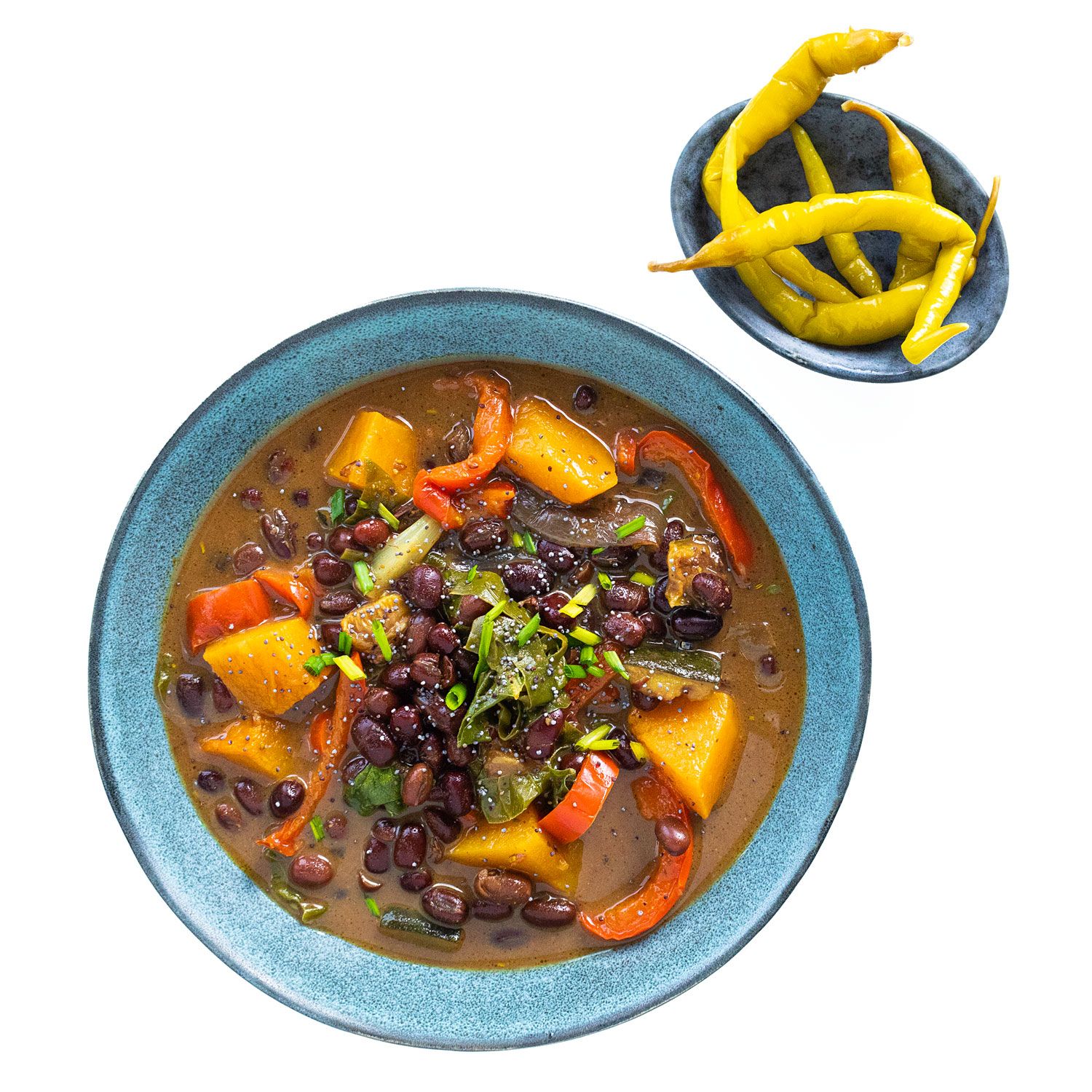 Añade la azukis + el resto de ingredientes + las verduras asadas + el agua de cocción a la slow cooker hasta cubrir 2 dedos por encima del nivel de los ingredientes y remueve hasta integrar.