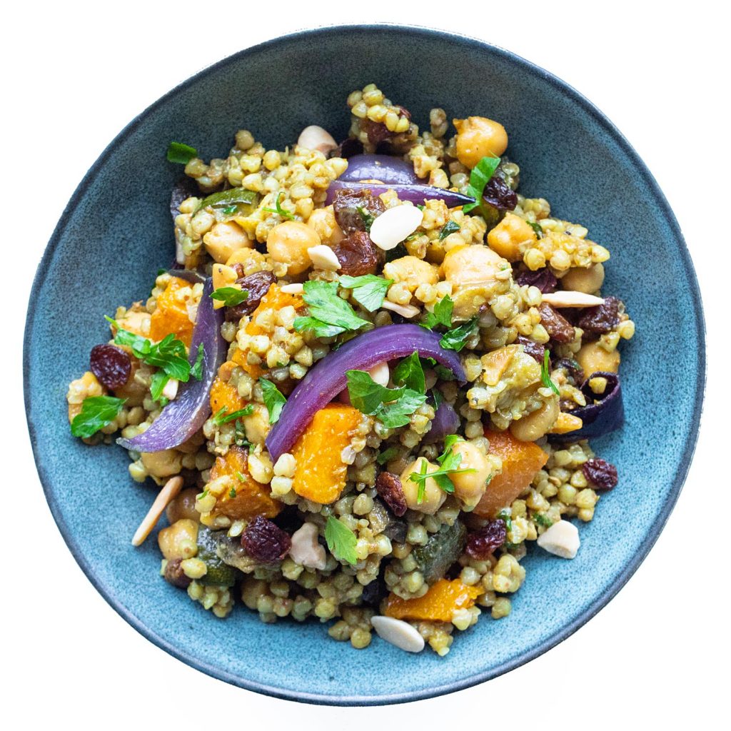 Añade el resto de ingredientes + el trigo (sustituye por el brócoli para AIP y paleo estricto) + las verduras asadas + ¼ tsp sal y remueve hasta integrar. Prueba el punto de sal y sirve.