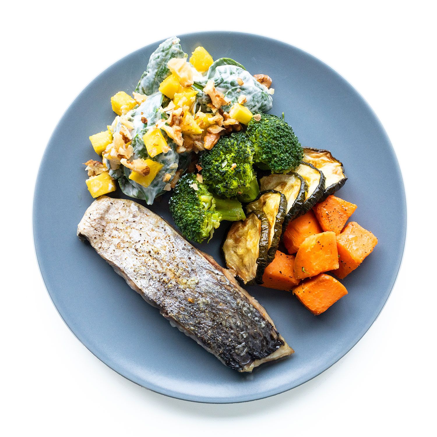 Sazona el pescado con ½ tsp sal y rocía con 1 Tbsp aceite de oliva. Coloca encima de las verduras