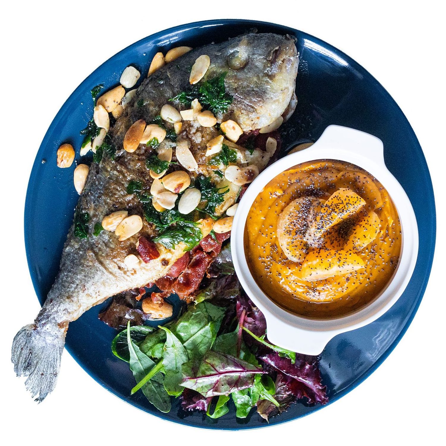 Sirve las doradas y acompaña con la crema + las mandarinas.