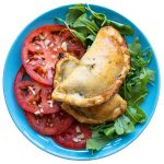 Cierra los bordes con pequeños pellizcos o con un tenedor (puedes pintarlos previamente con un poco de agua para que peguen mejor). Pinta con la mezcla de huevo y leche de coco sobrante de la empanada.