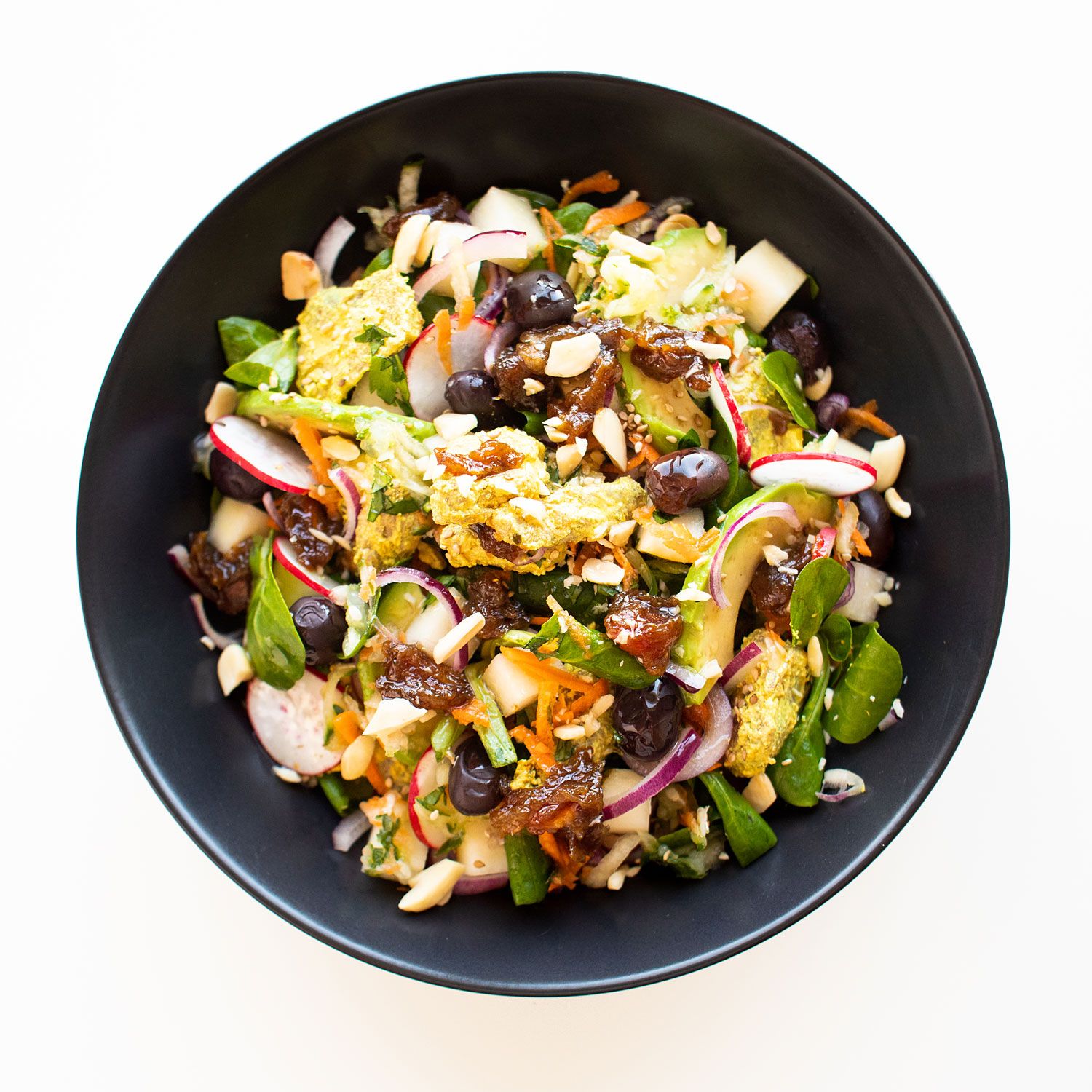 Espolvorea las almendras + las aceitunas. Sirve y disfruta.