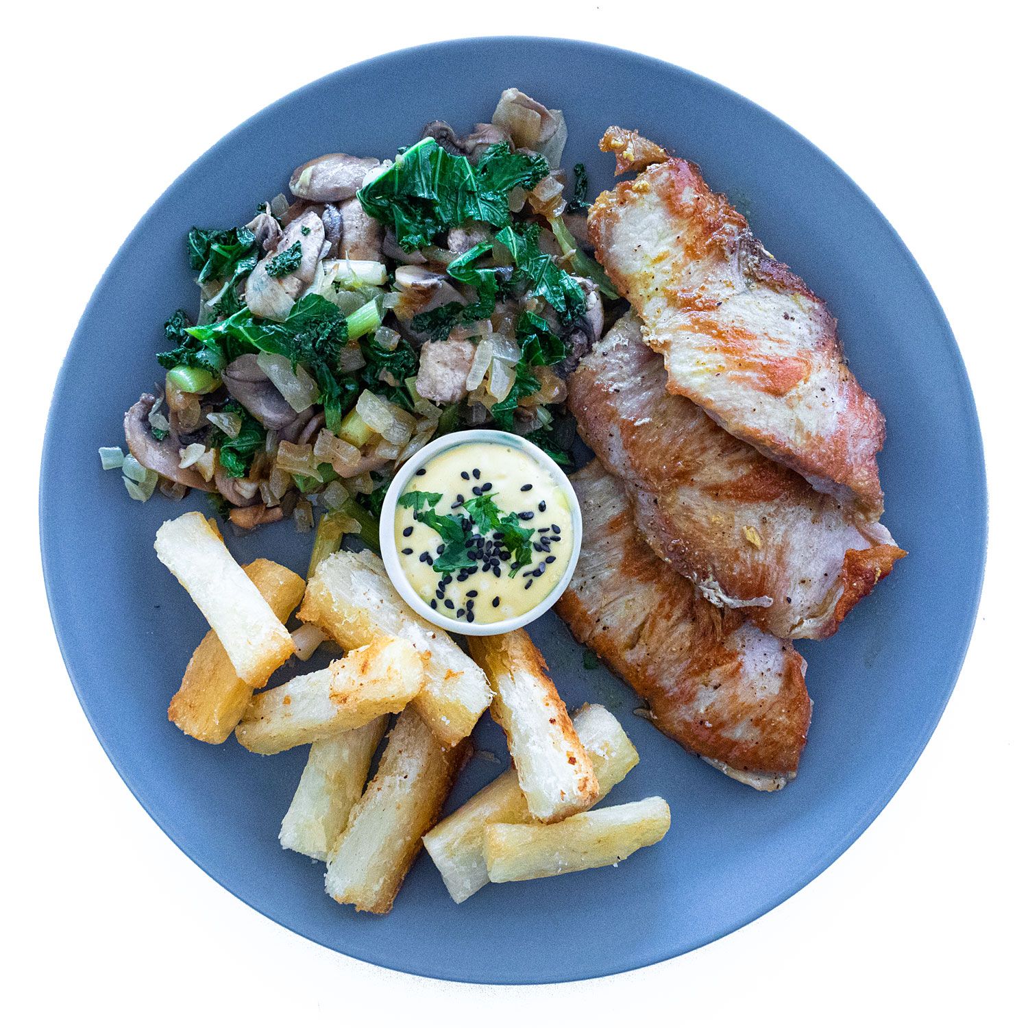 Sirve los filetes con el salteado. Acompaña con la yuca y el alioli.