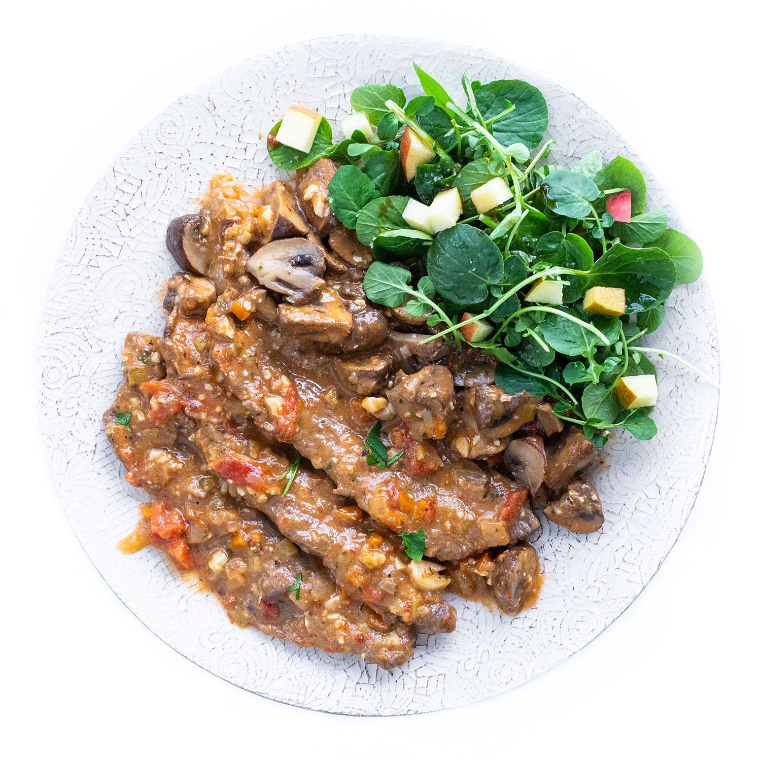 Sirve el fricandó con setas y acompaña con la ensalada.