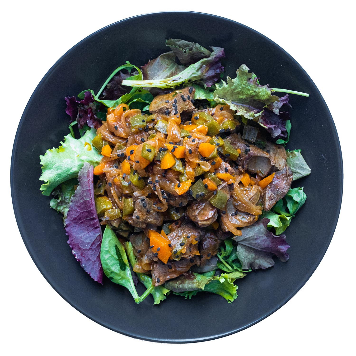 Pon a fuego alto con ½ Tbsp aceite de oliva y añade el hígado + ¼ tsp sal. Rehoga durante 3 minutos o hasta que se dore un poco. Añade las verduras.
