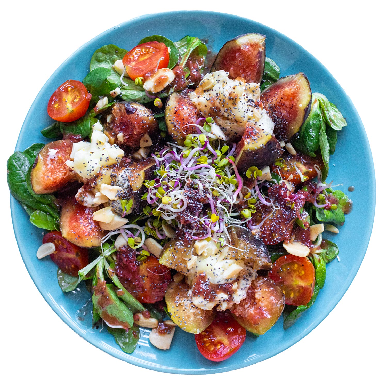 Pon los higos rellenos encima y aliña con la vinagreta. Sirve.