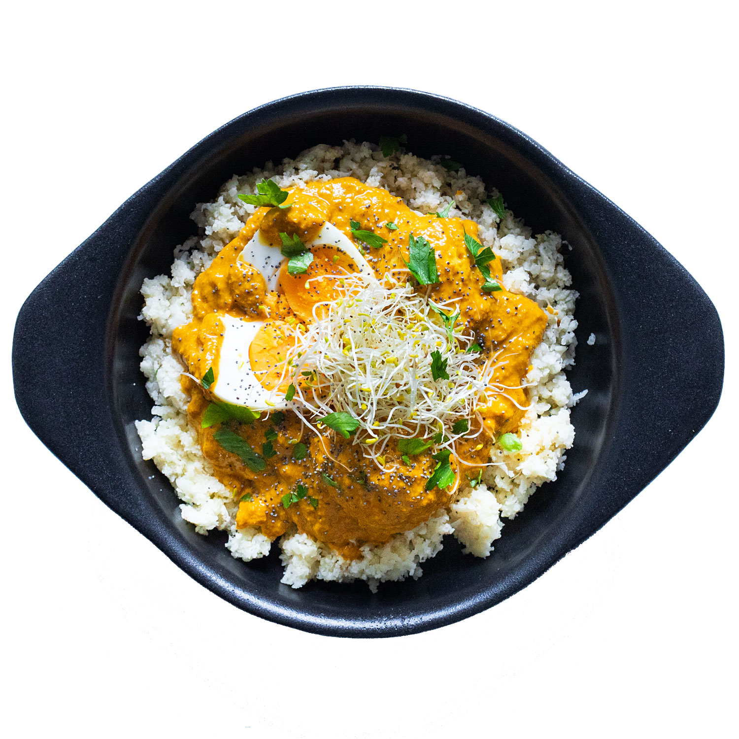 Sirve los huevos sobre la coliflor y decora con los brotes + el cilantro.