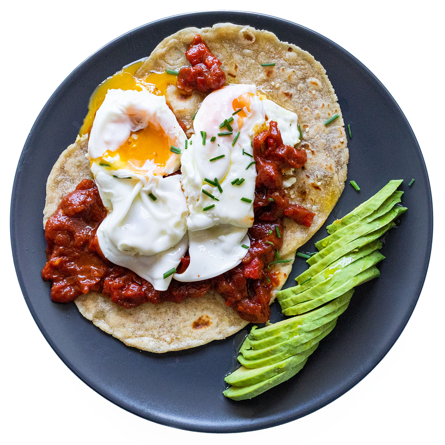 Sirve la salsa + el huevo (sustituye por el lomo para AIP) sobre las tortillas. Acompaña con el aguacate.