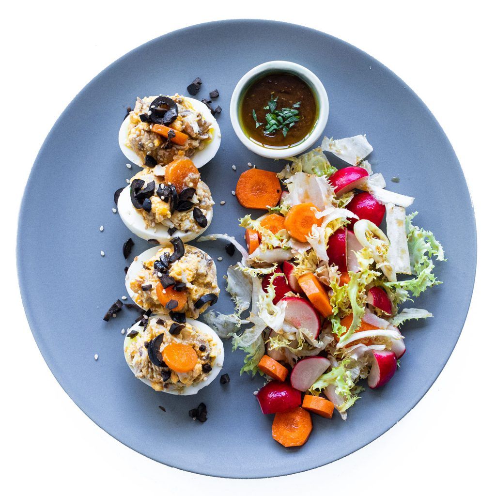 Sirve los huevos decorados con las aceitunas + el sésamo. Acompaña con la ensalada.