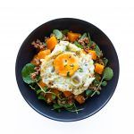 Coloca la calabaza + el huevo + el picadillo sobre los berros. Decora con el cebollino y sirve.