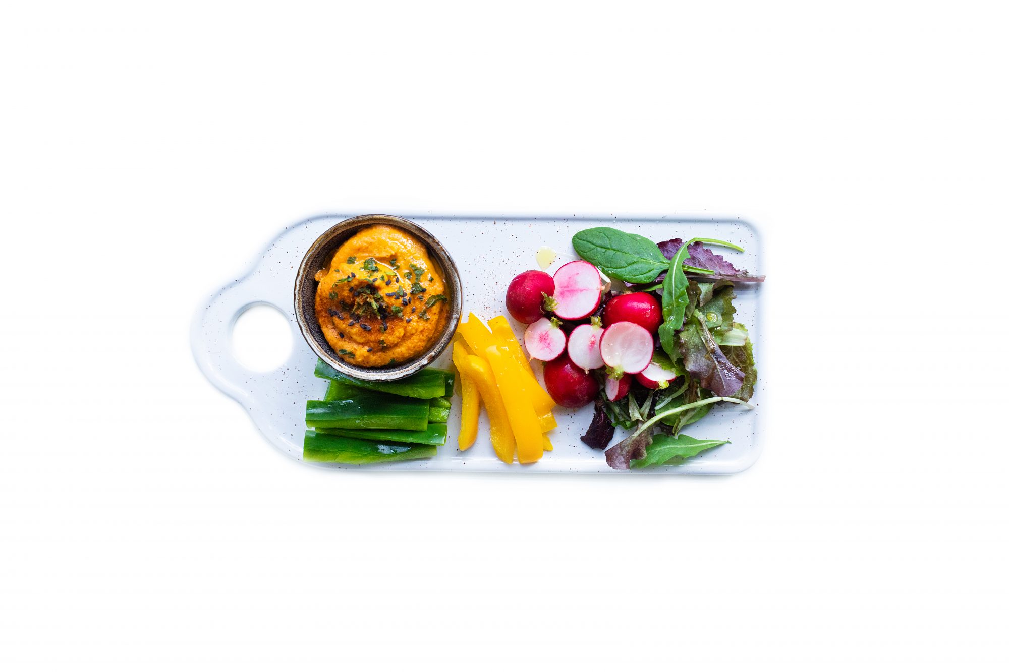 Decora el hummus con las semillas y acompaña con los crudités + el mezclum.