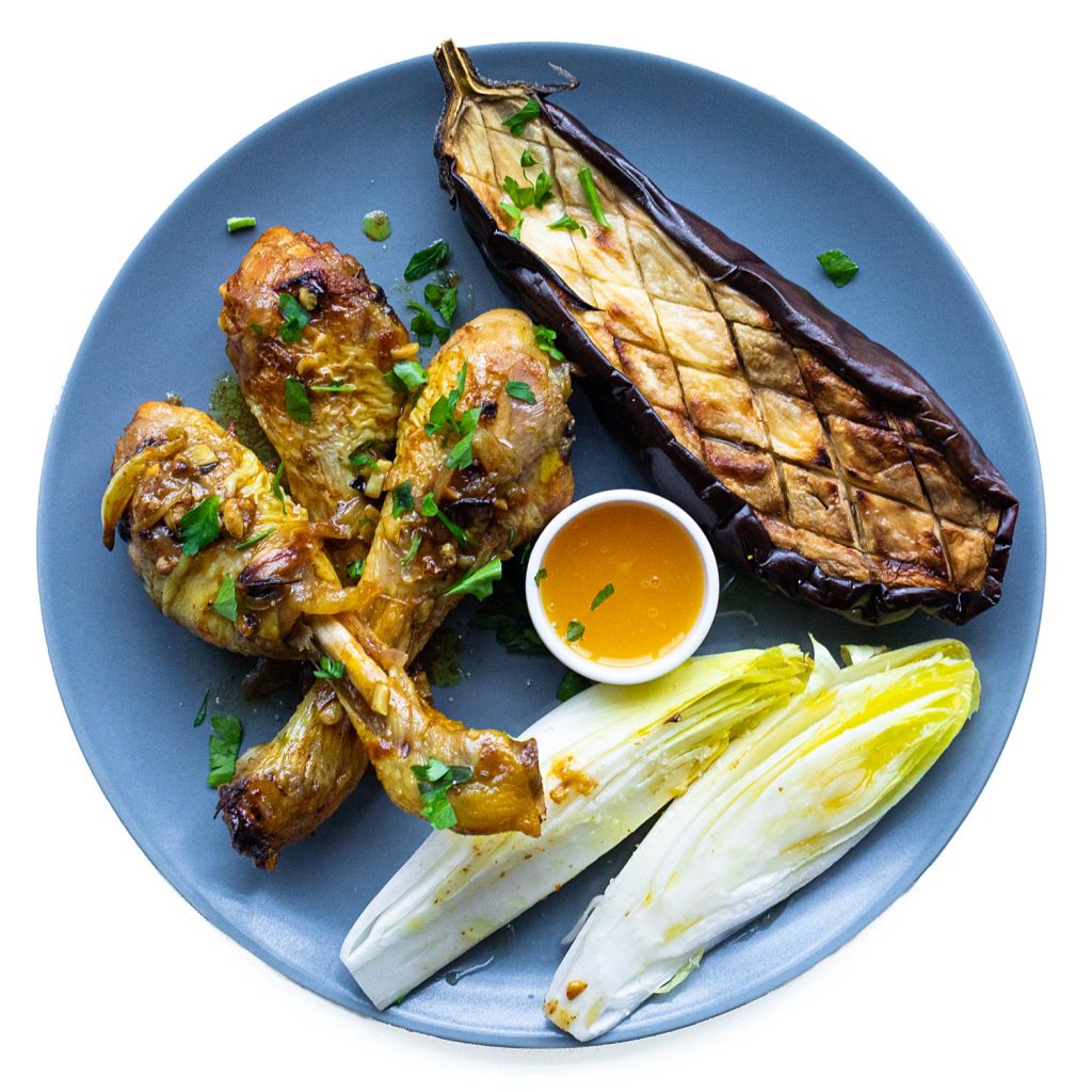 Sirve los jamoncitos con la berenjena + las endivias y acompaña con la salsa. Decora con el perejil.