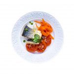 Sirve la lubina con el pesto y acompaña con el tomate + la zanahoria. Decora con la albahaca.