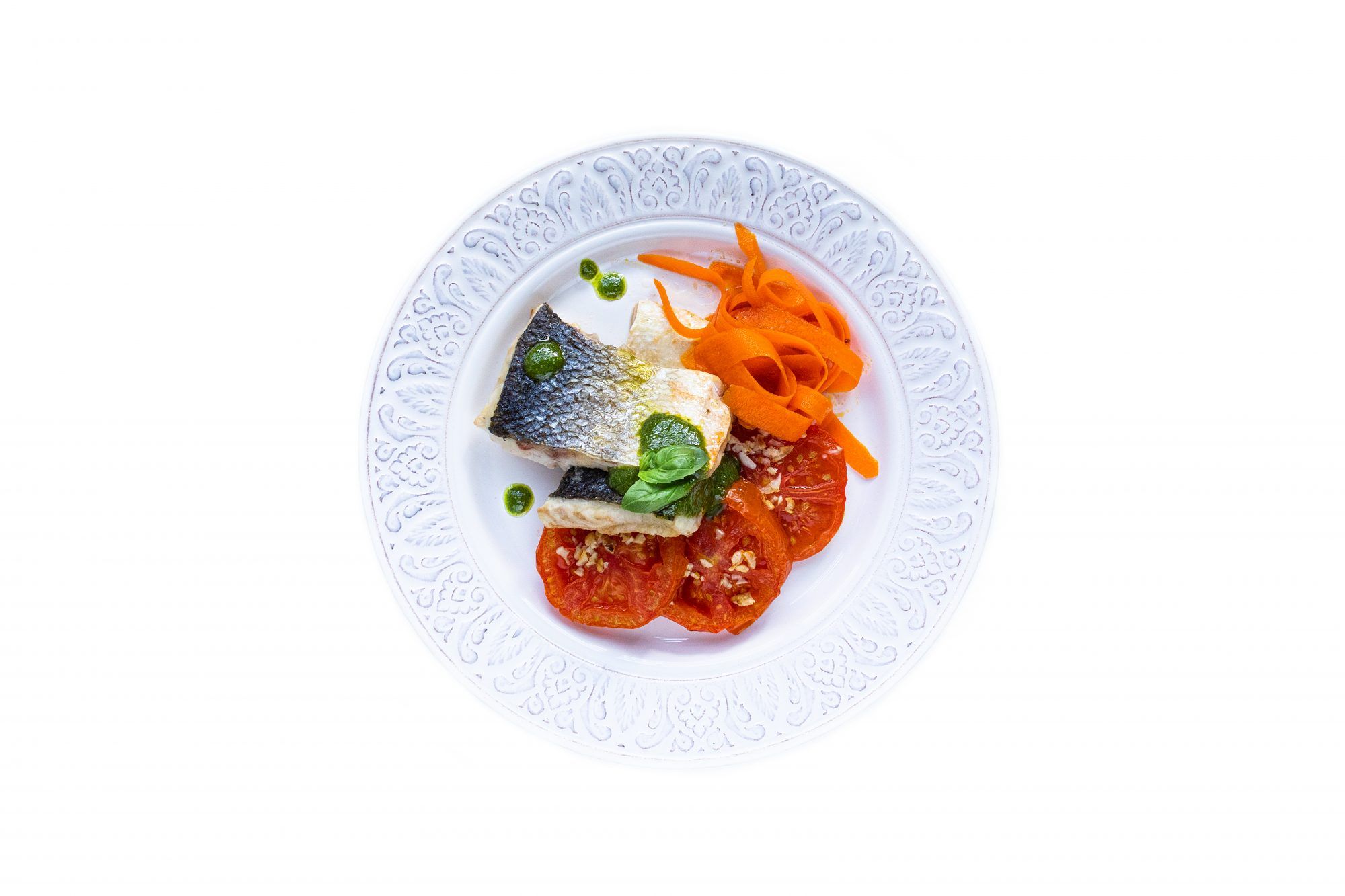 Sirve la lubina con el pesto y acompaña con el tomate + la zanahoria. Decora con la albahaca.
