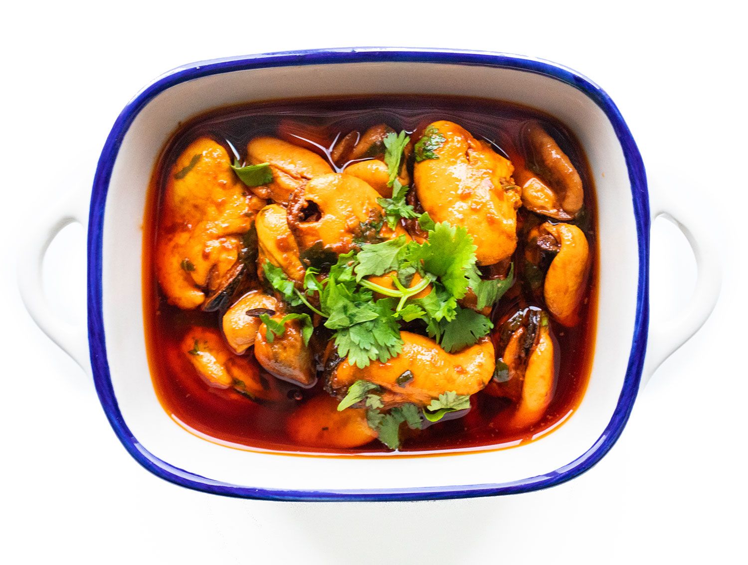 Separa la sartén del fuego, añade el pimentón y remueve hasta que se integre por completo. Añade el resto de ingredientes,mezcla bien y vierte sobre los mejillones rápidamente. Remueve para que se impregnen del escabeche.