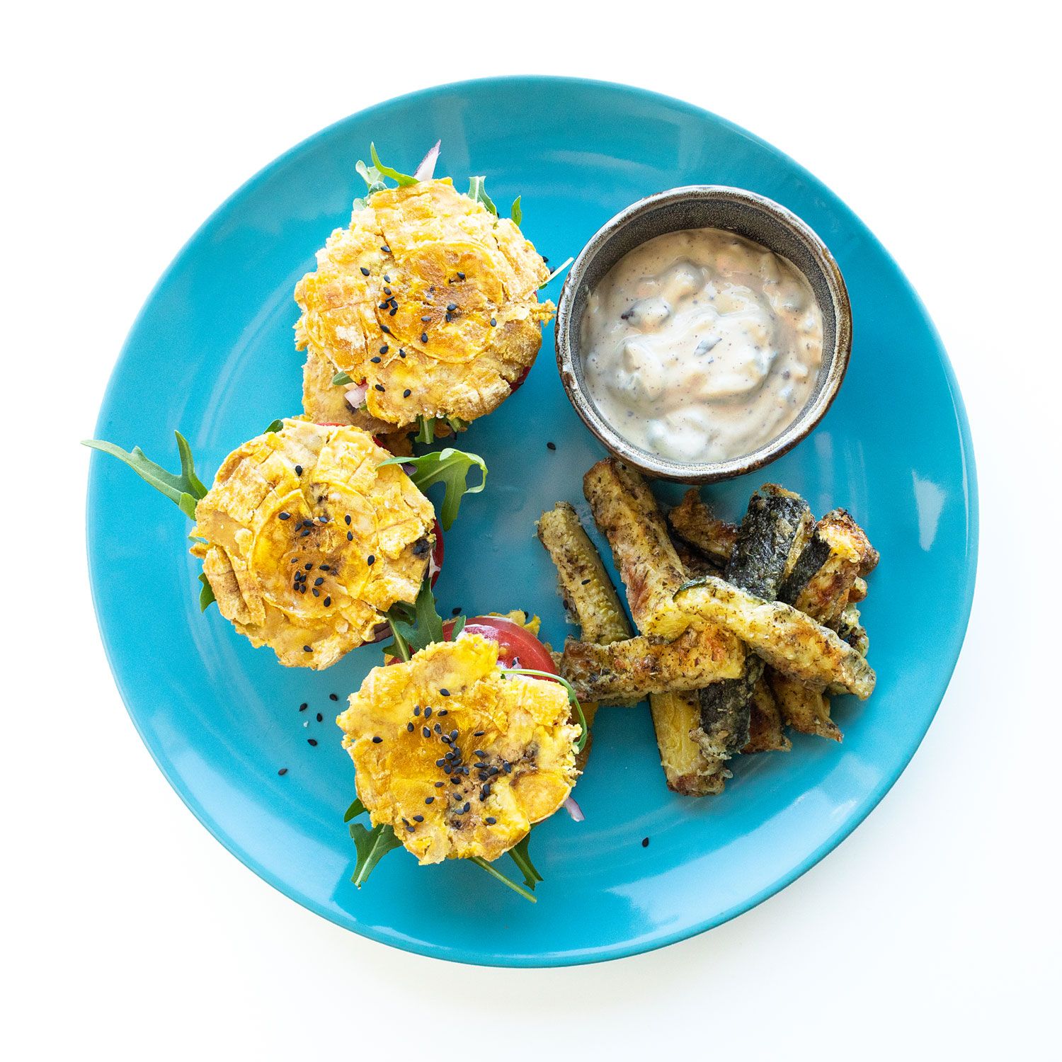 Sirve las mini hamburguesas acompañadas de los palitos de calabacín.