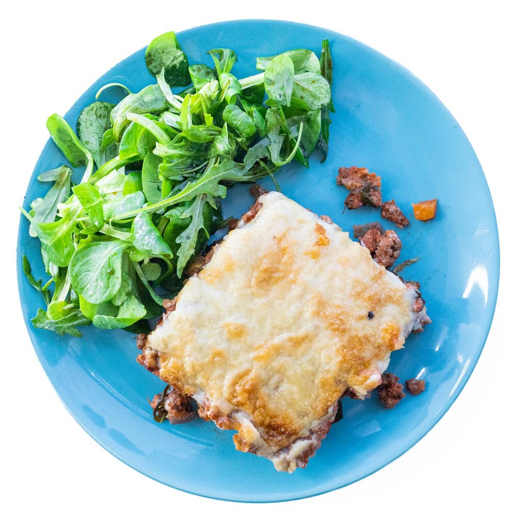 Sirve la moussaka y decora con la albahaca. Acompaña con la rúcula.