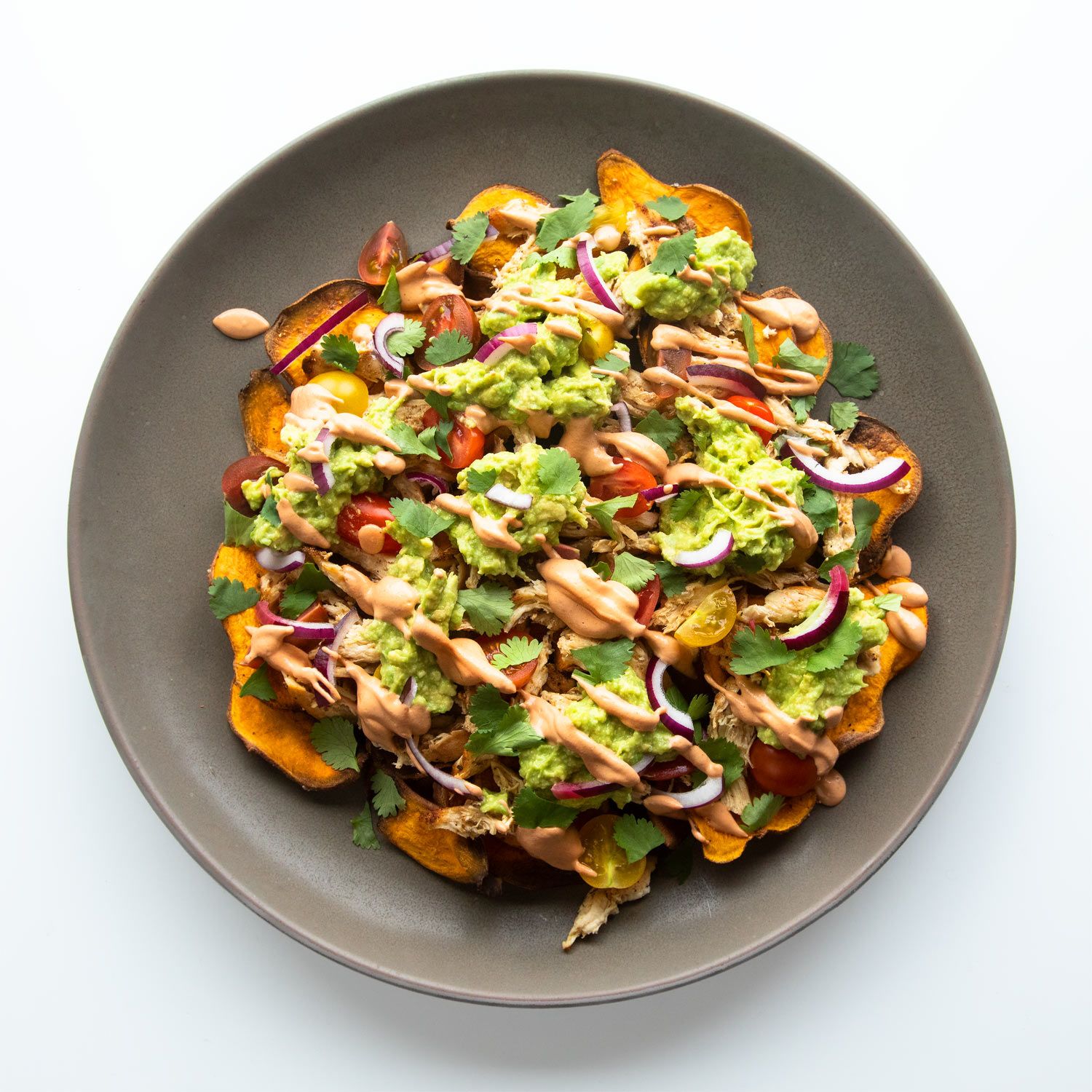 Para montar los nachos, coloca los chips de boniato sobre un plato grande o fuente y por encima añade el pollo y cualquier otro topping que os guste. Yo te he dejado algunas ideas, pero puedes añadir distintas combinaciones de ingredientes: queso rallado para fundir (si consumes lácteos, y meterlo bajo el grill del horno un rato), aguacate en trozos, pico de gallo, aceitunas, zumo de lima...