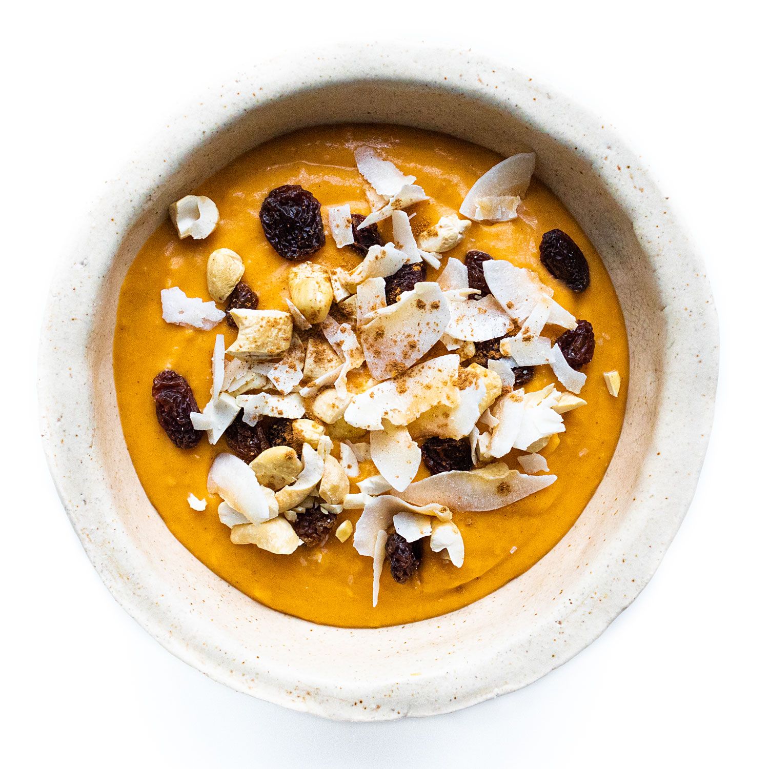 Tritura el boniato asado + todos los ingredientes (excepto el almidón y el zumo) con la batidora de vaso, de mano o el procesador durante 2 minutos o hasta que la mezcla sea homogénea.