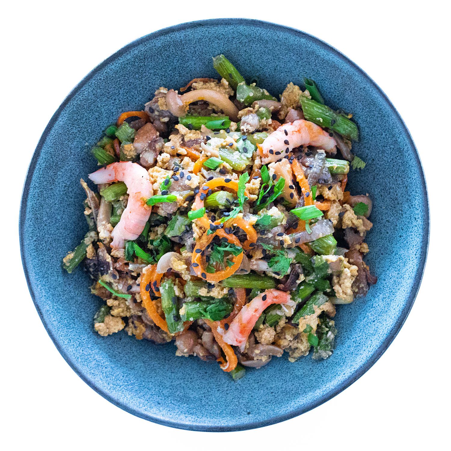 Añade la pimienta + el ajo + el tamari + las gambas y remueve. Cocina durante 2-3 minutos o hasta que la carne de las gambas deje de ser transparente.