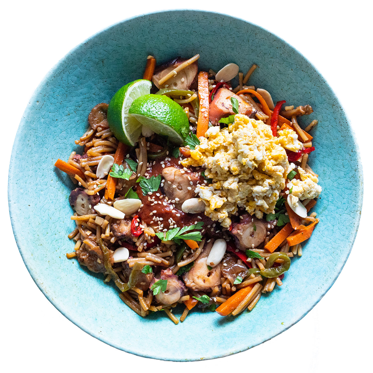 Sirve el pad thai y decora con los frutos secos + el cilantro. Exprime la lima.