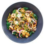Añade la ternera + las gambas y saltea durante 4-5 minutos o hasta que se doren un poco.